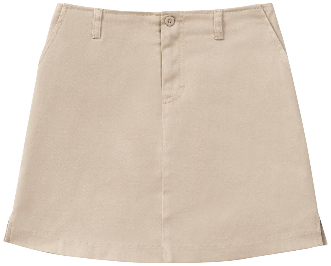 Stretch twill scooter with flat front and back panels, zip fly, two side pockets, belt loops, side vents at hemline and built-in poly knit shorts. 53% Cotton, 45% Polyester, 2% Spandex. Imported.